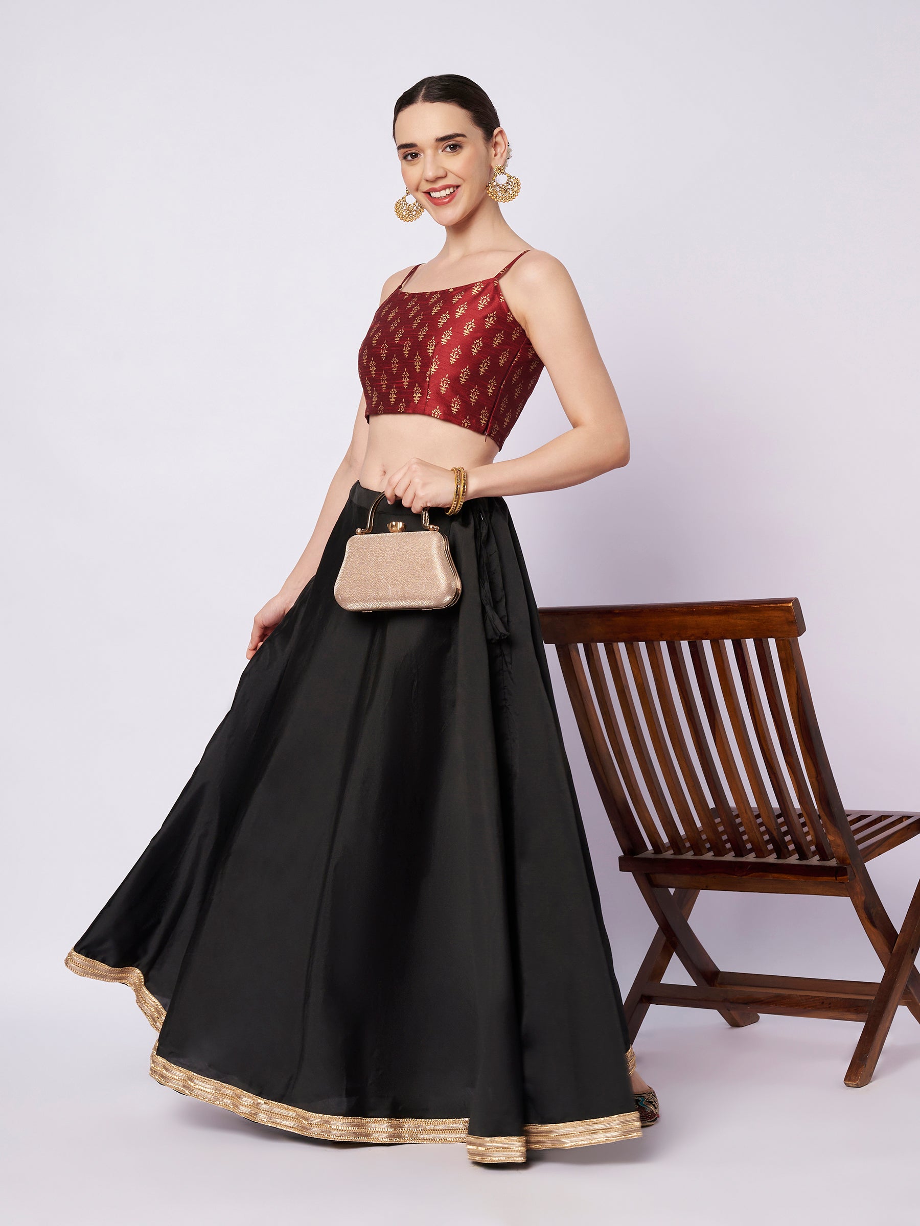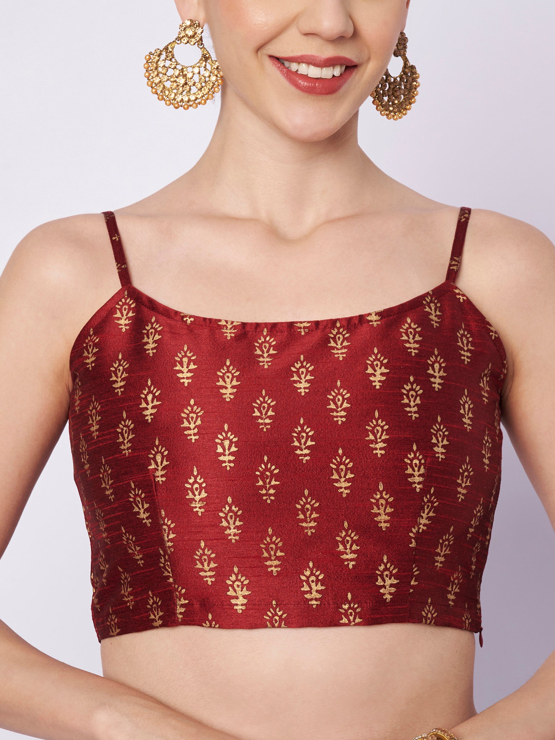 Get traditionally stylish with this blouse. This silk blend blouse features an all over elegant hand block print in a ethnic pattern. It come with lining, zipper and adjustable shoulder straps for a comfortable fit. Team it up with a block printed lehenga skirt or a saree and a box clutch for that perfect festive look.