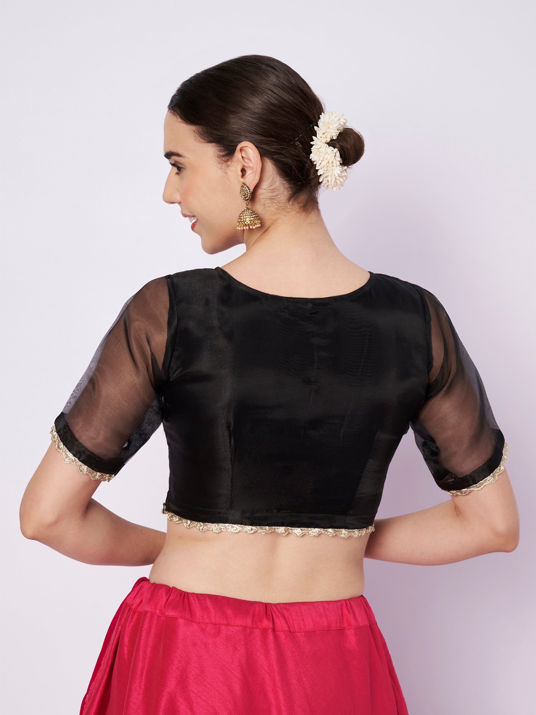 Add elegance to your wardrobe with this organza blouse. This solid blouse features a keyhole neckline and elbow length sleeves which is highlighted with a lace which adds to the richness. It comes with a side zipper to ensure easy wear and a comfort fit. Pair it up with a contrasting skirt to complete the full ensemble.