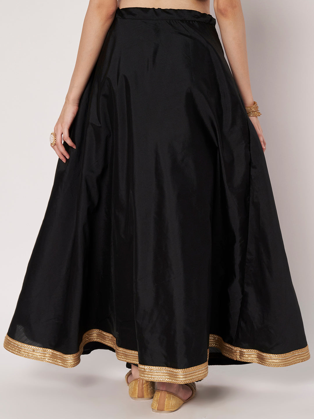 Flaunt sartorial elegance with this dupion skirt. This versatile solid bias skirt comes a side zip and drawstring. The hem is highlighted with an intricate lace which adds to the richness. This skirt comes with full lining for a comfortable fit. It will surely fetch you compliments for your rich sense of style.