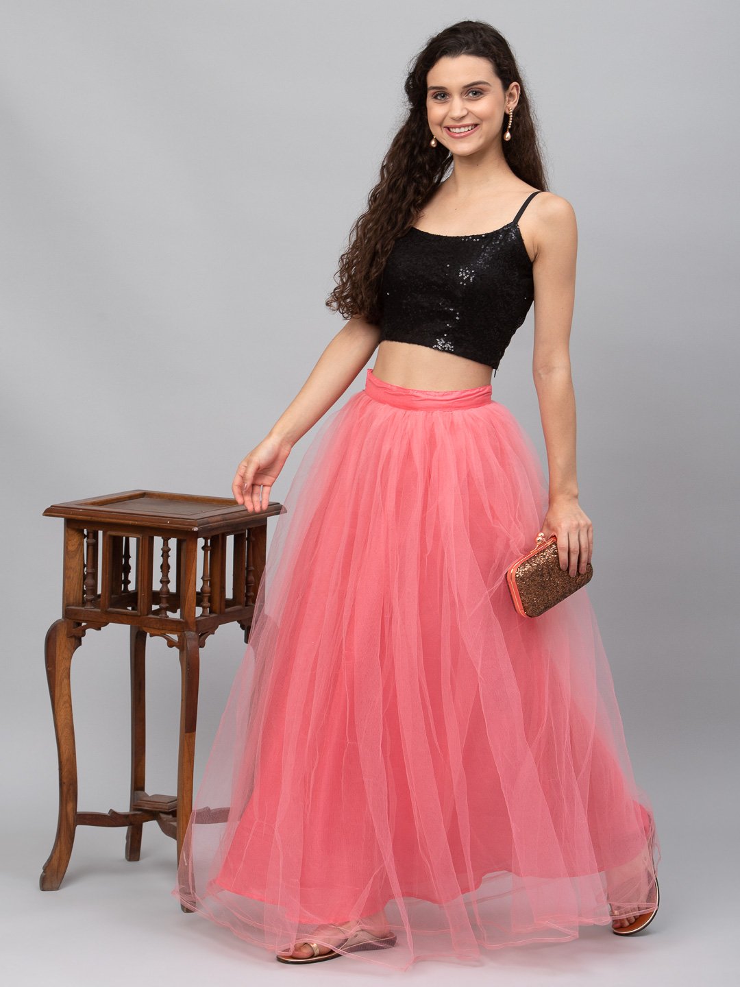 Make a style statement with this Georgette blouse. This blouse features a sequin floral embroidery pattern in gold, with strap on the shoulder for a contemporary look. Tailored for a comfortable fit, this blouse comes with a side zipper and lining. Team it up with a contrasting lehenga skirt and a box clutch for that perfect festive look.