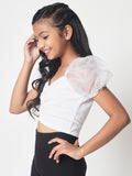 Slip into this chic top and head out in style. This top is crafted with an attractive organza puff sleeves with elastic around the hem and an elegant sweetheart neckline.