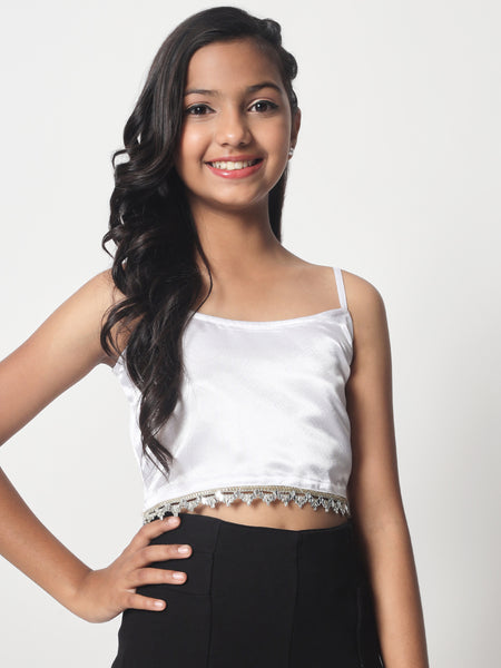 Embrace a chic look with this satin crop top. This solid crop top features a round neck and spaghetti staps. A perfect look for a dinner, pair it up with a skirt and statement earrings to complete the ensemble.