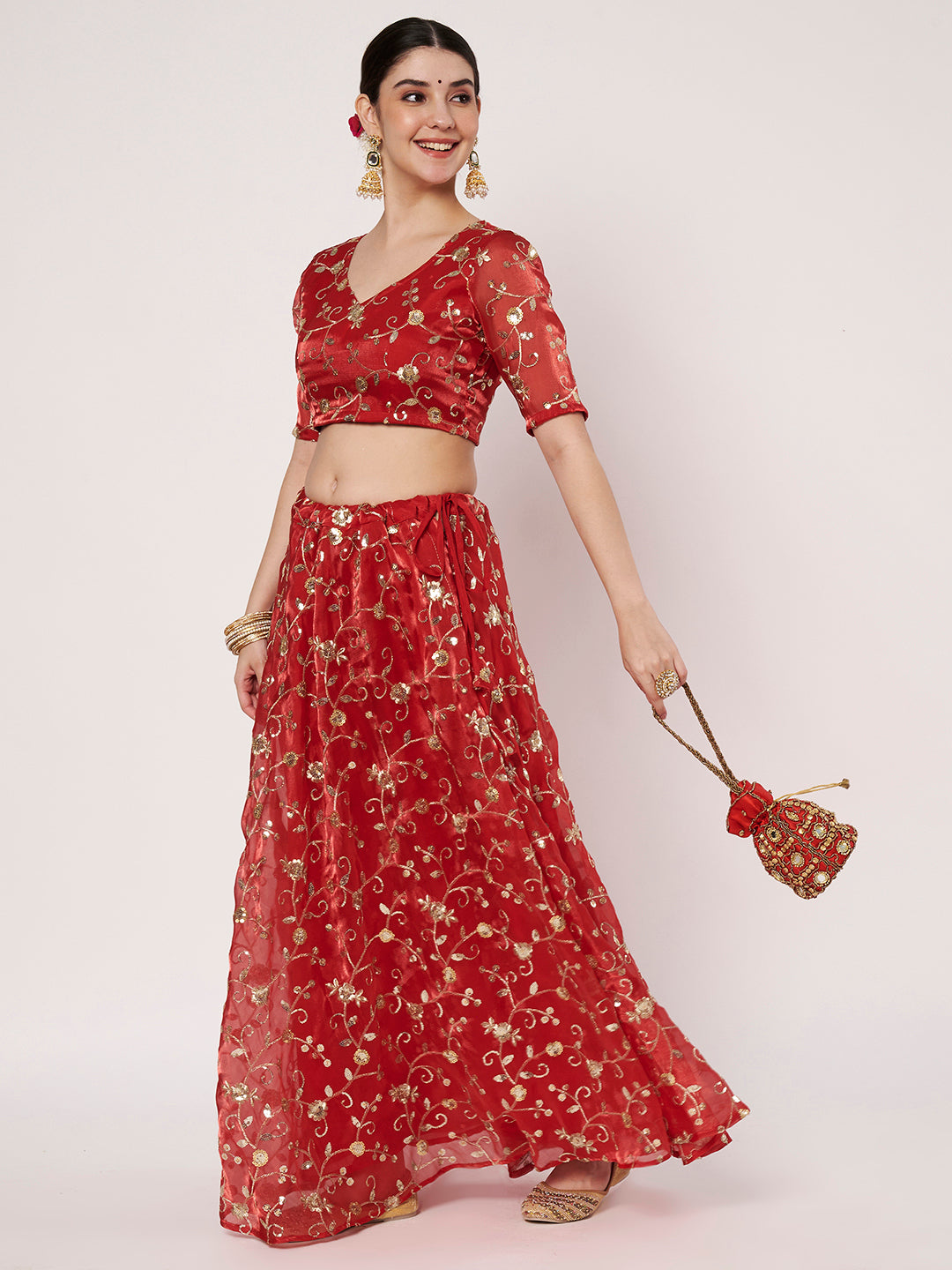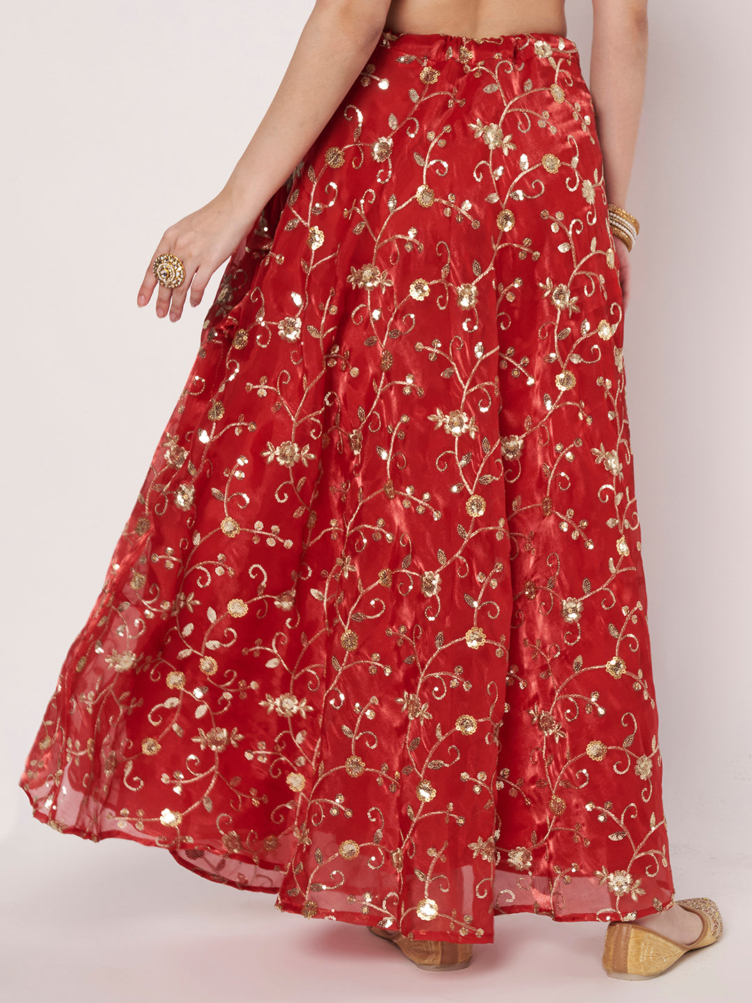 Embrace a chic look with this organza skirt. This bias skirt features an all over sequin and zari embroidery in a floral pattern. It comes with a side zip, drawstring waist and lining to ensure a comfort fit. Pair it up with a matching blouse, dupatta and heels for a fun look.