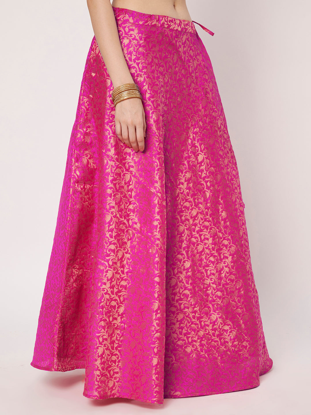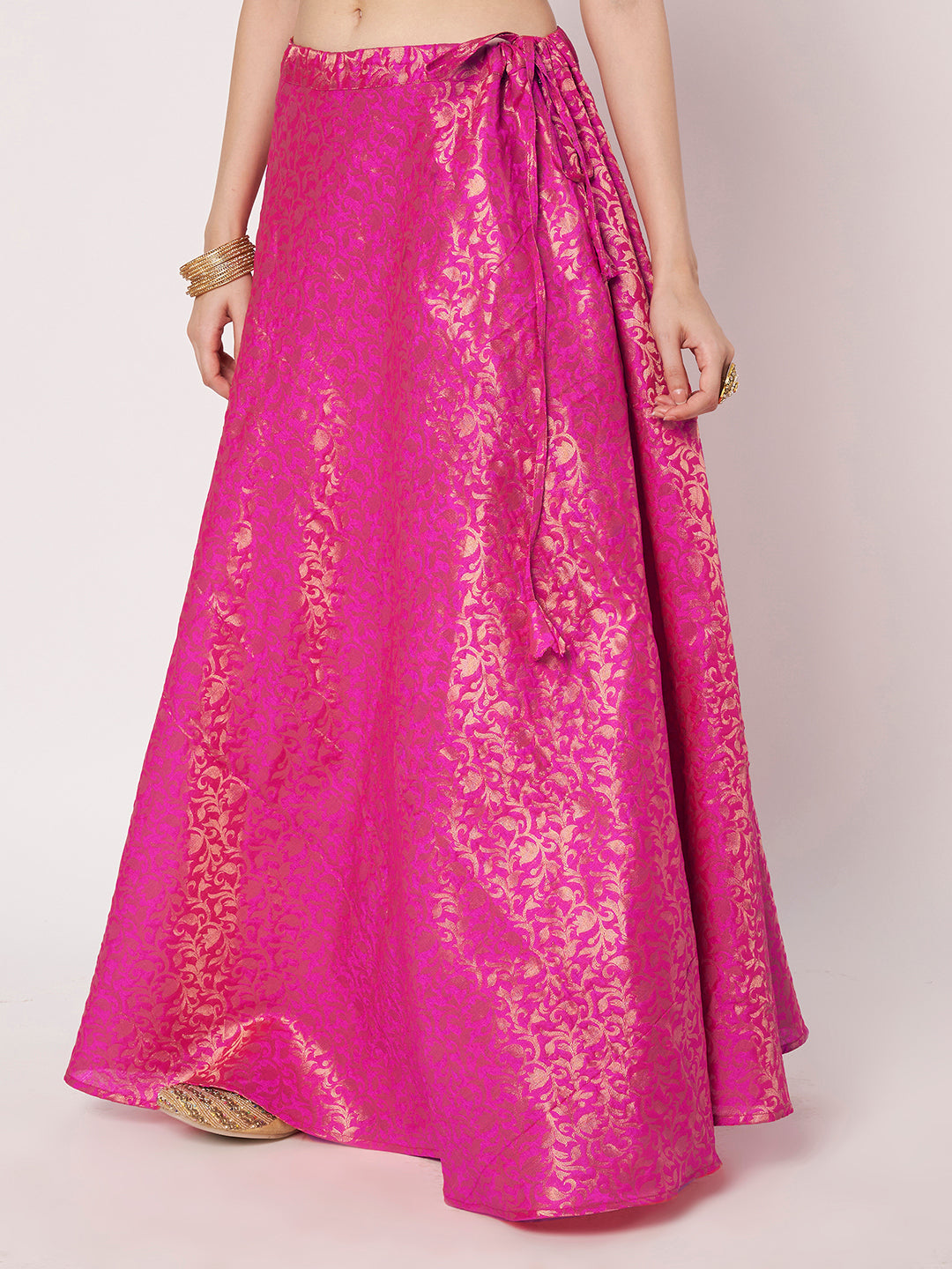 Add elegance to your wardrobe with this skirt. This bias skirt features an all over woven brocade in floral pattern in gold zari. The skirt comes with a drawstring waist and a side zip for a comfortable fit. To complete the ethnic look this skirt can be paired with a matching top and net dupatta.