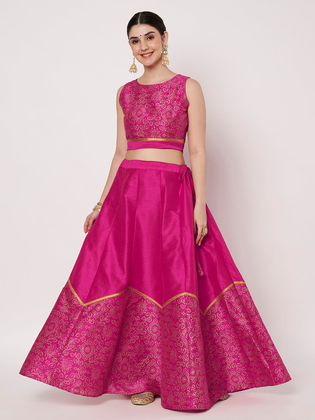 Look ravishingly beautiful by wearing this dupion lehenga set. This kalidaar skirt featuring an elegant floral hand block printed panel in each kali creating a beautiful zig-zag pattern. It comes with a full lining and a drawstring waist for easy wear. This skirt can be paired with a matching blouse and a dupatta to complete the ensemble.