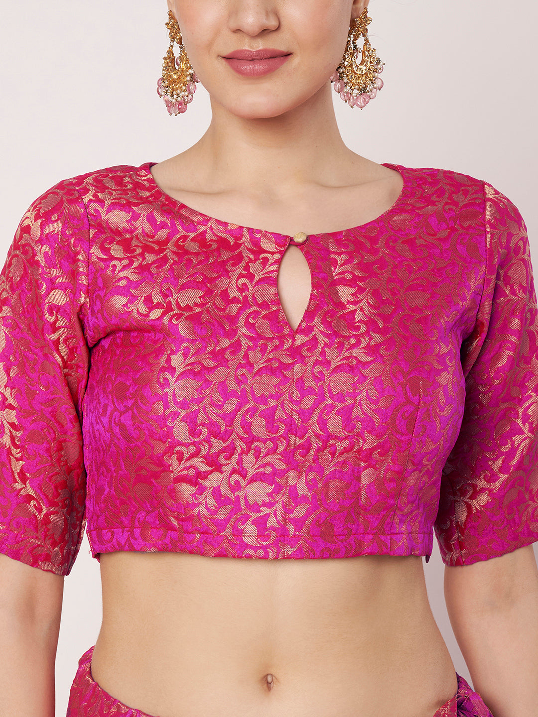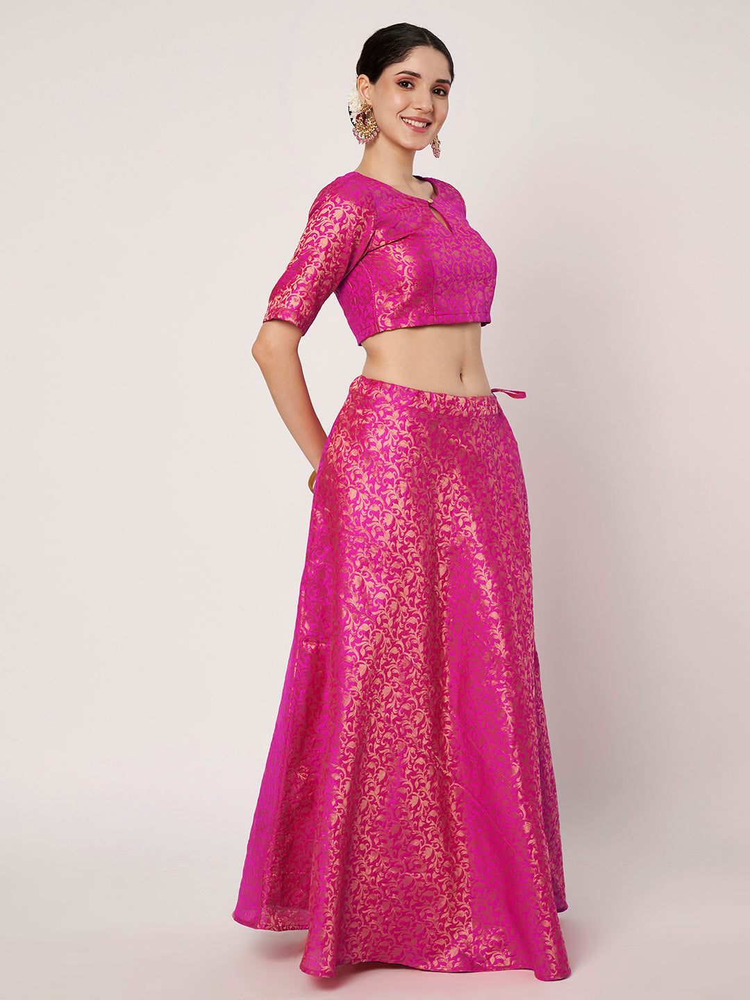 Flaunt sartorial elegance with this brocade lehenga set. This bias skirt features an all over woven floral pattern with gold and pink zari. This skirt comes with full lining, drawstring and side zip for a comfortable fit and extra flare. The skirt comes with a matching brocade crop top and a net embroidered dupatta. Complete this look with heels and contemporary earrings.