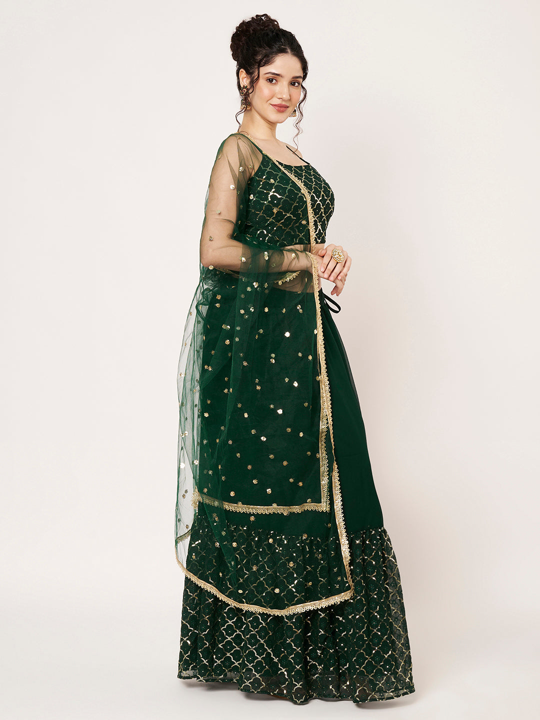 Flaunt sartorial elegance with this georgette lehenga set. This tiered skirt features a beautiful sequin embroidery on the tier. This skirt comes with full lining and drawstring for a comfortable fit and extra flare. The skirt comes with a matching embroidered blouse and a net dupatta. Complete this look with heels and comtemporary earrings.