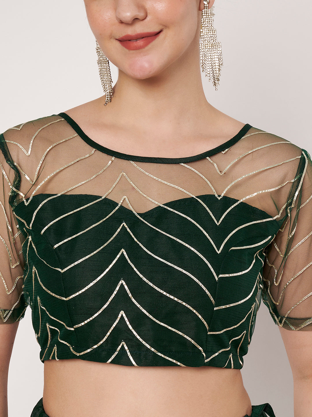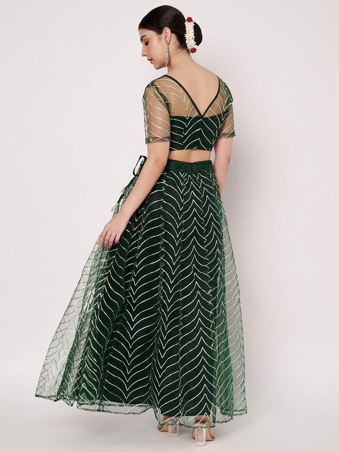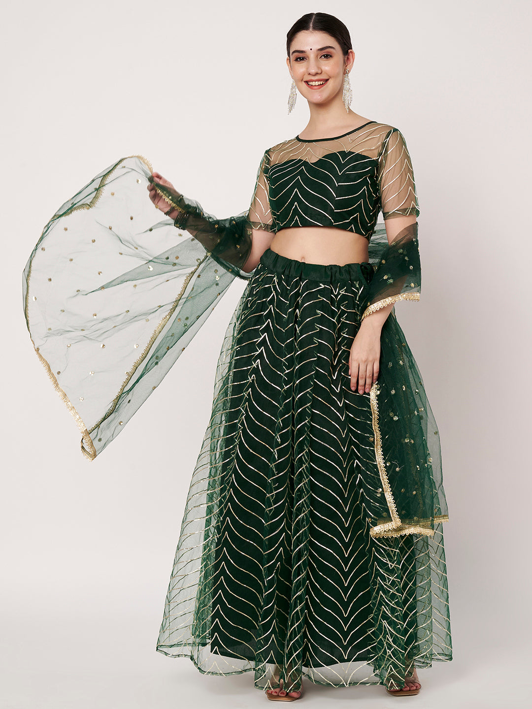 Look ravishingly beautiful by wearing this lehenga set. This kalidaar skirt featuring an elegant gota embroidery on net fabric. It comes with a full lining and a drawstring waist and side zip for easy wear. Paired up with a matching embroidered blouse with sheer sleeves and back hooks for perfect festive look.