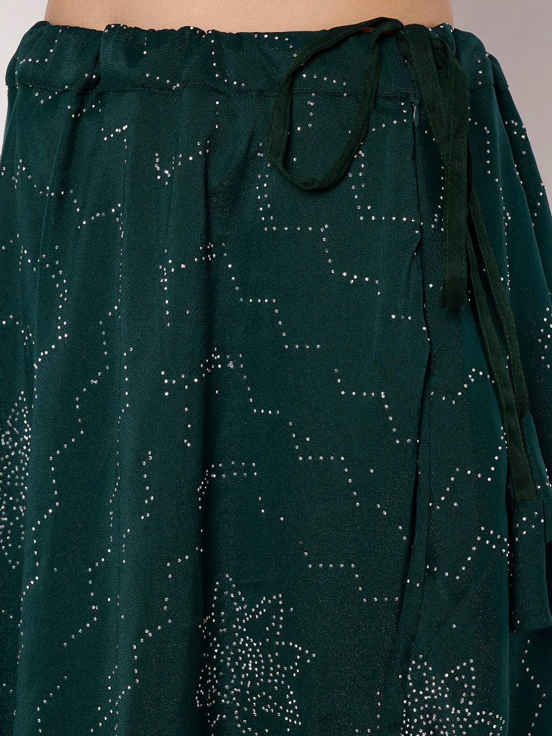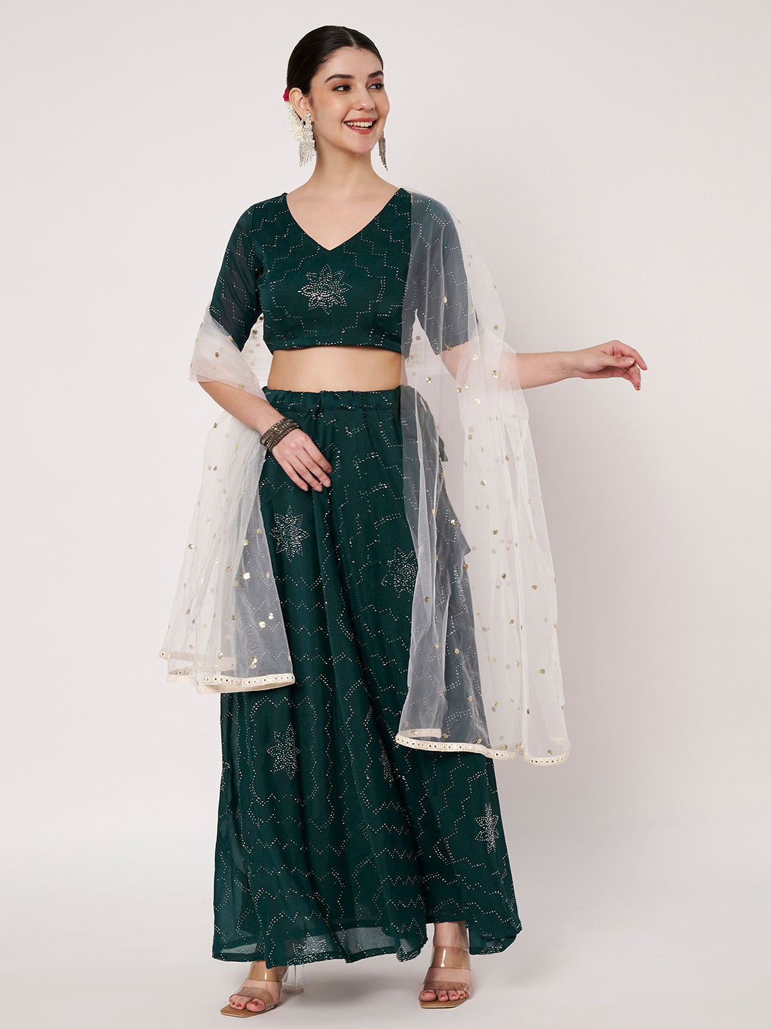 Capture a graceful look with this silk blend lehenga set. This bias skirt features an all over crystal embellishment in a floral pattern. It comes with a side zip, drawstring waist and lining to ensure a comfort fit. The skirt comes with a matching embroidered blouse and a net dupatta. Complete this look with heels and comtemporary earrings.