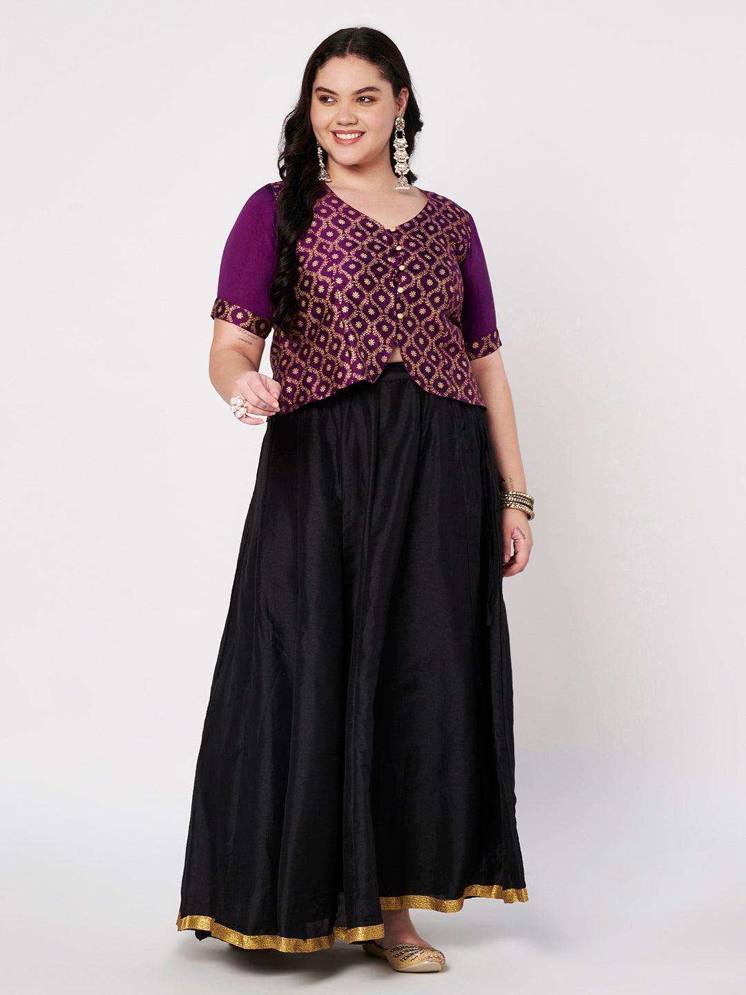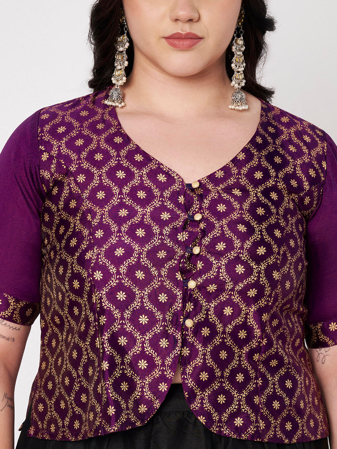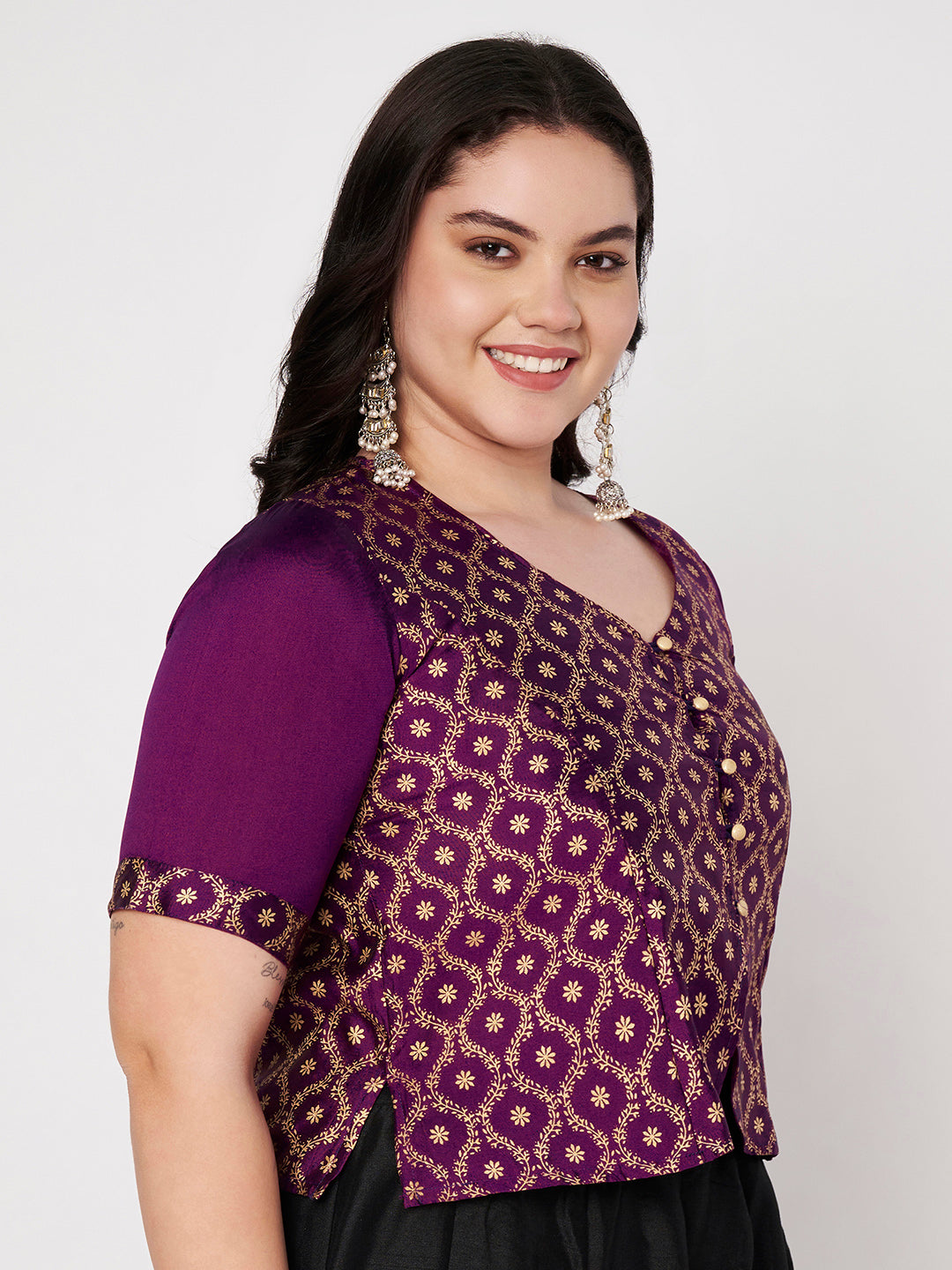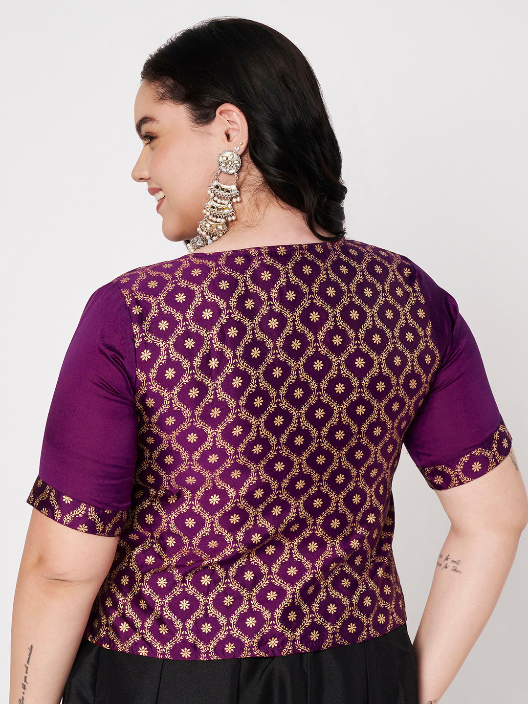 Look your traditional best with this silk blend Blouse. The Blouse features an elegant all over block printed jaal and solid elbow length sleeves. Team it up with a lehenga skirt or saree and a dupatta for that perfect festive look.