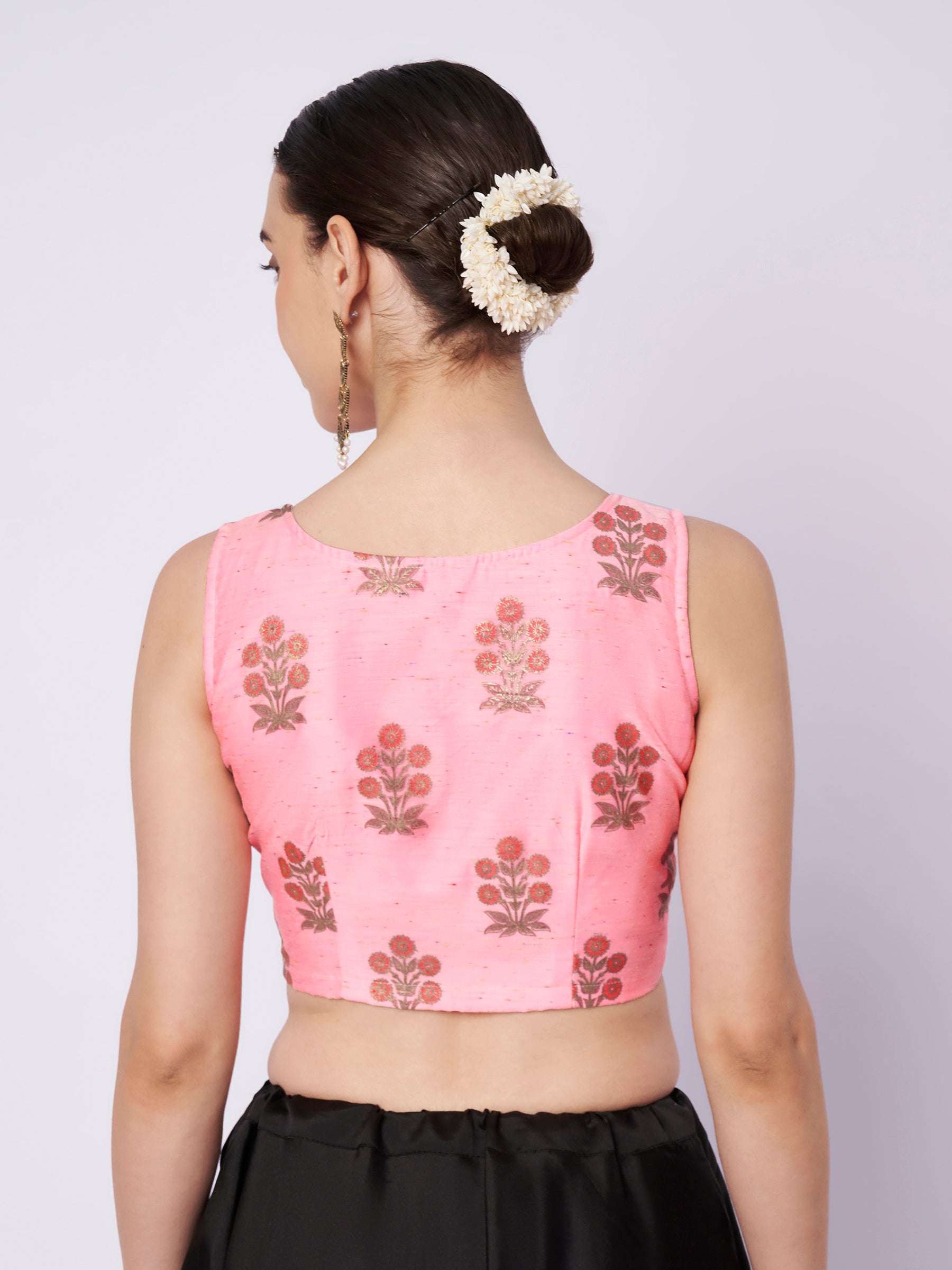 Notch up your style quotient with this readymade blouse. This blouse features an elegant all over floral print in a multicoloured pattern. Tailored for a comfortable fit, this blouse comes with a side zipper. Team it up with a lehenga skirt and a box clutch for that perfect festive look.