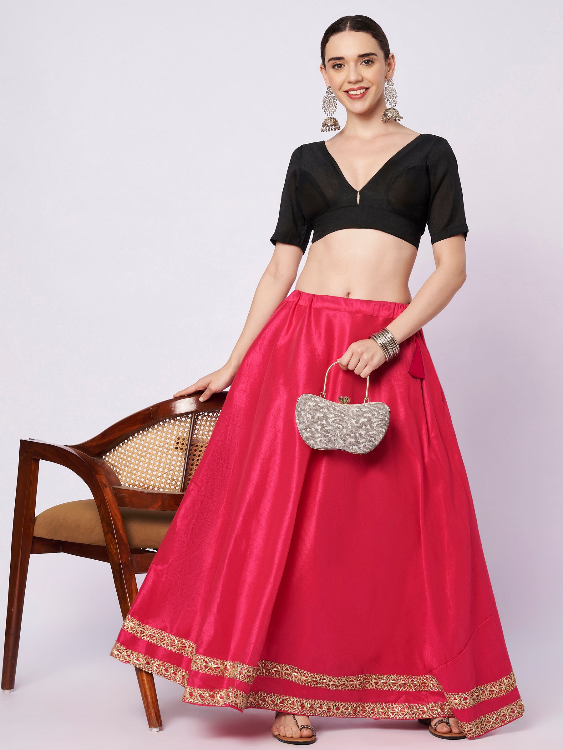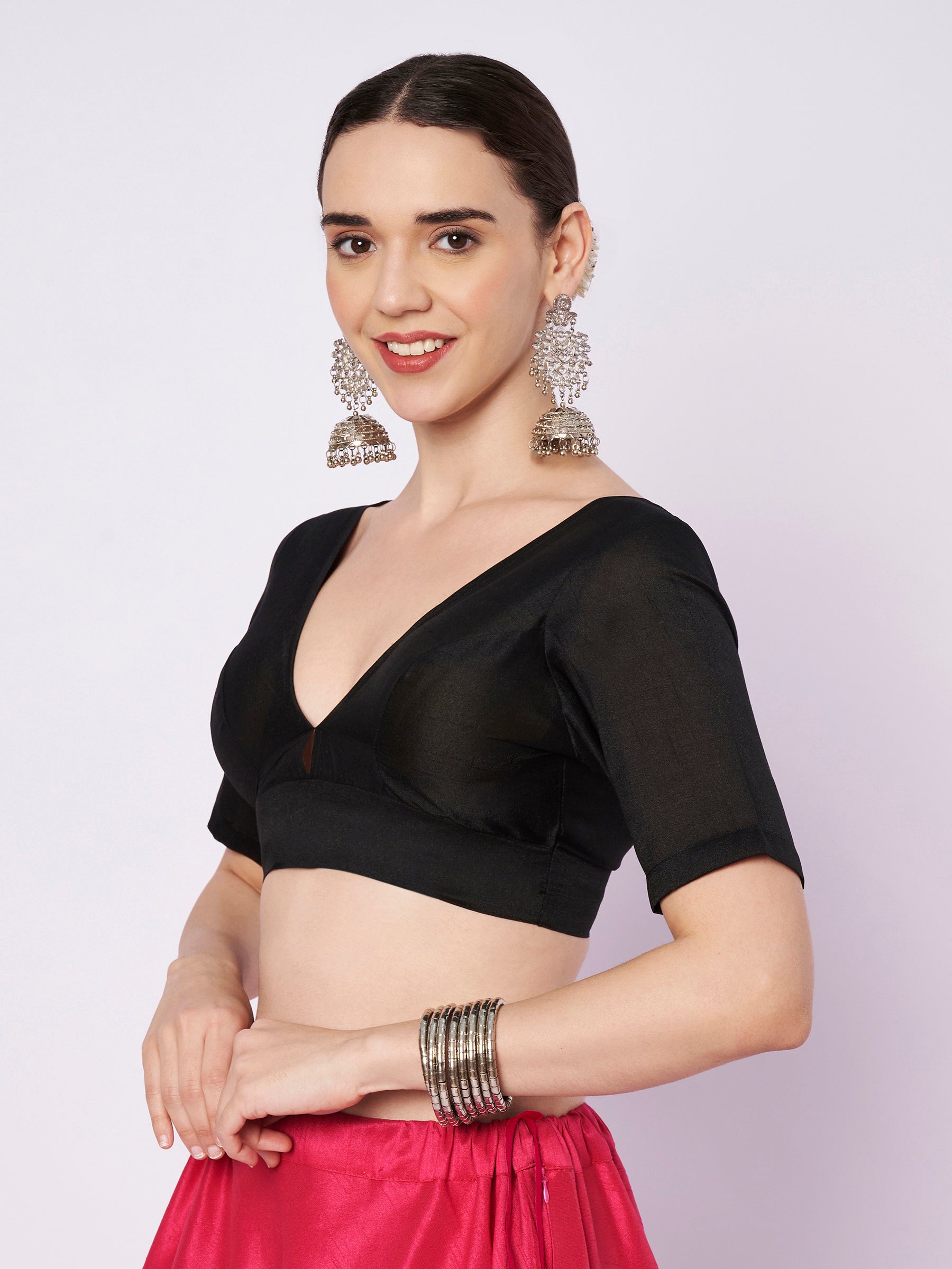 Embrace a chic look with this chroma blouse. This solid padded blouse features a deep V-neckline, elegant elbow length sleeves and hooks at the back for a comfortable fit. A perfect look for a festive occasion, pair it up with a saree and statement earrings to complete the ensemble.